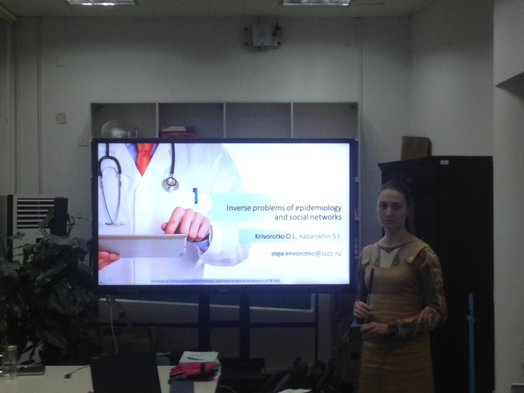 2017年11月24日,俄罗斯新西伯利亚大学Olga Krivorotko副教授应邀来我中心做了专题学术报告。报告题目为“Inverse problems of Epidemiology and Social Networks”。