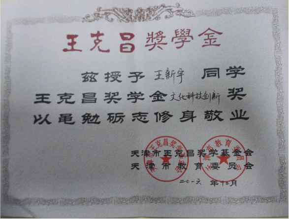 2016年12月,我中心博士生王新宇荣获王克昌奖学金文化科技创新奖。